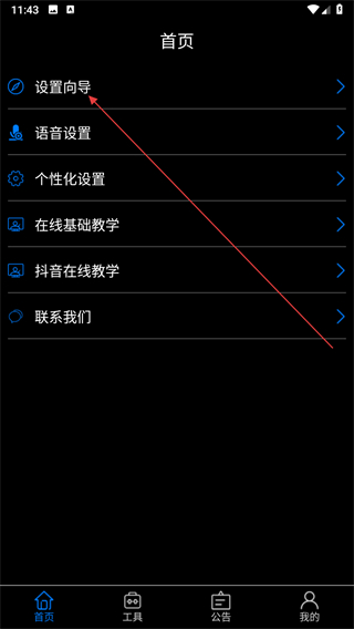 1、打开保益悦听APP,在首页点击设置向导选项,进入设置向导页面。