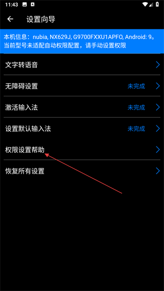 2、在设置向导页面找到权限设置帮助选项,点击进入权限设置帮助页面。