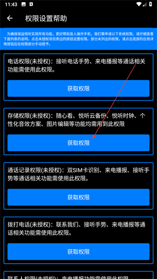 3、在权限设置帮助页面找到存储权限板块,点击其下方的获取权限按钮。