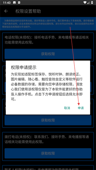 4、在权限申请提示框中点击申请按钮,按照系统提示完成存储权限的授予。