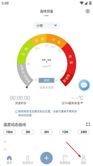 通过自行设置提示温度值,当体温达到设定温度时,手机APP发出高温提示。