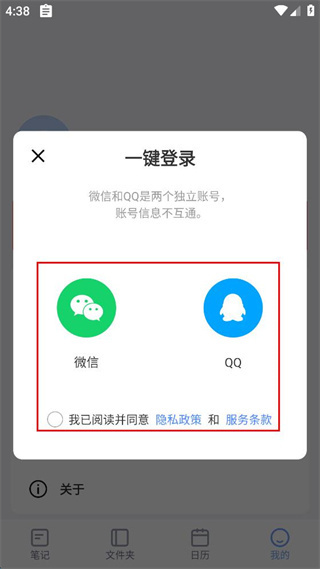 3、在一键登录窗口选择微信或QQ登录方式,勾选同意隐私政策和服务条款,完成登录。