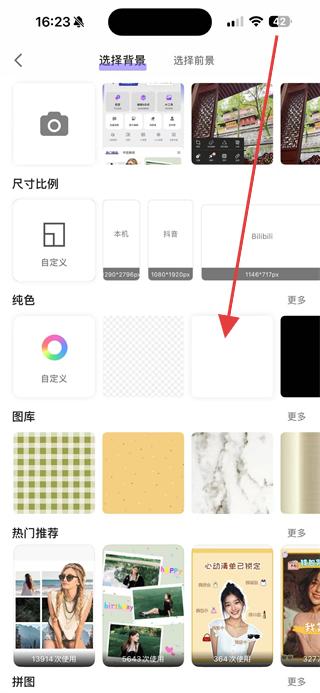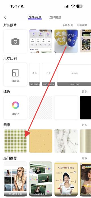 2、在选择背景板块中,从所有照片、纯色、图库、热门推荐等分类里挑选合适的背景样式。