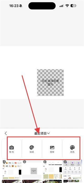 4、从最近项目的相机、贴纸、图库等选项中,选择需要更换背景的前景图片,完成Photoroom换图片背景的操作。