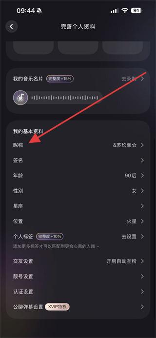 3、在完善个人资料界面中点击昵称,进入修改昵称页面。
