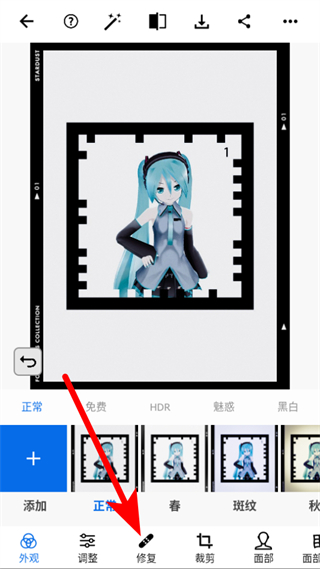 3、进入照片编辑界面后点击底部修复工具,进入修复功能界面。