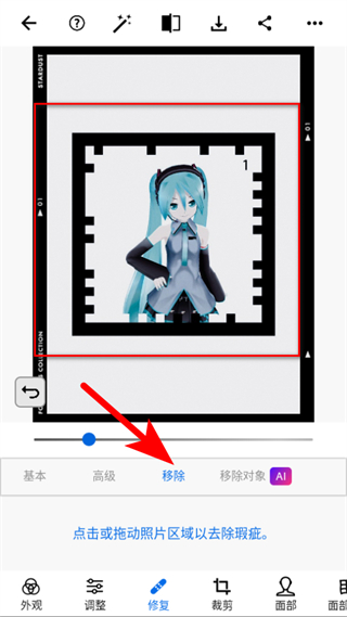 4、在修复功能界面中选择移除相关选项,点击或拖动照片区域进行抠图操作。