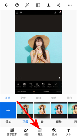 3、进入照片编辑界面后点击底部背景工具,进入背景编辑流程。