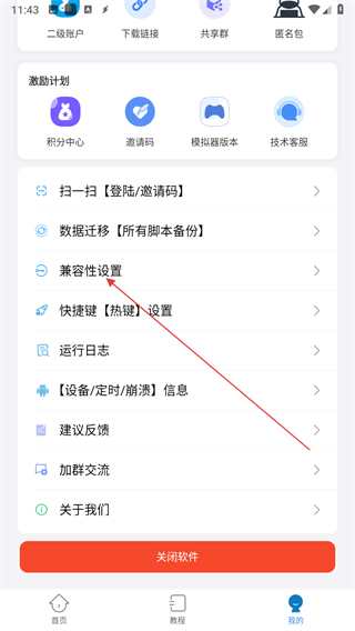 2、在个人页面找到兼容性设置选项,点击进入兼容性设置页面。