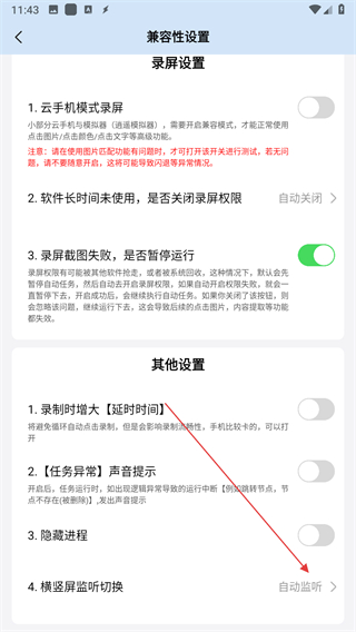 3、找到横竖屏监听切换的选项,点击进入屏幕类型选择页面。