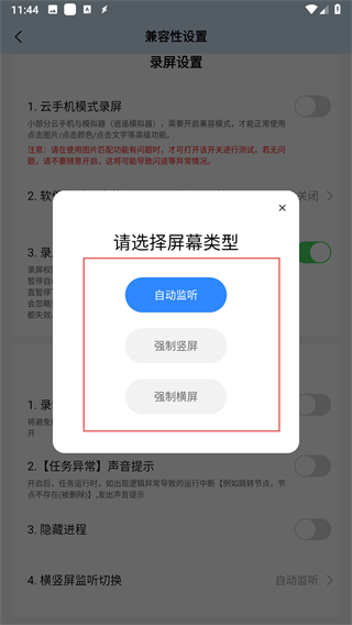 4、在弹窗中,选择自动监听、强制竖屏、强制横屏三种屏幕类型。