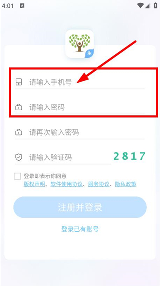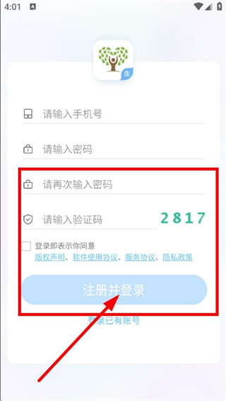 3、再次输入密码,输入验证码,点击注册并登录,完成注册登录操作。