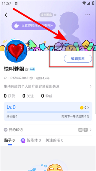 3、在个人主页中,点击编辑资料按钮,进入编辑资料页面。