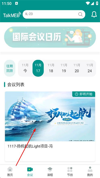 2、点击底部导航栏的会议,可以查看国际会议日历,了解即将开始或往期回顾的医学会议,方便医学从业者及时掌握会议动态,参与学术交流。