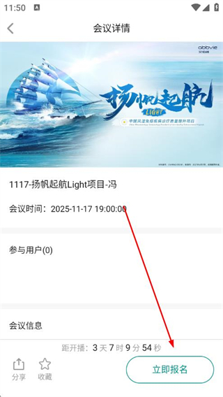 3、在会议详情页面点击立即报名,待会议开始后即可进入直播。