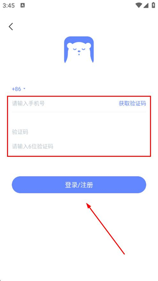 2、输入手机号码,获取并输入验证码后,点击登录/注册。