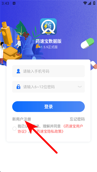1、打开药速宝APP,我们需要在登录界面点击新用户注册。