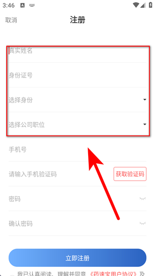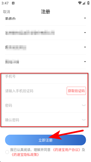 3、继续填写手机号等剩下的信息后,点击立即注册,完成账号注册操作。