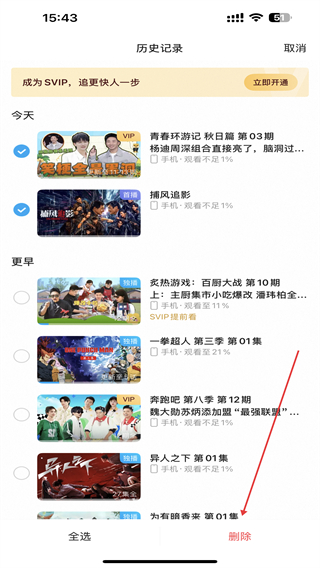 4、勾选要删除的视频内容后,点击右下角删除按钮。