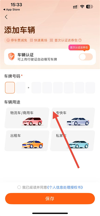 3、在页面填写车牌号码,选择车辆用途,勾选同意相关授权书后,点击保存按钮即可完成车辆添加。