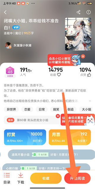 1、打开菠萝包轻小说APP,找到想要阅读的小说,点击点击阅读进入阅读界面。
