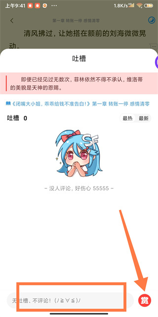 3、在小说阅读界面,点击右侧弹幕图标,弹出弹幕输入框。