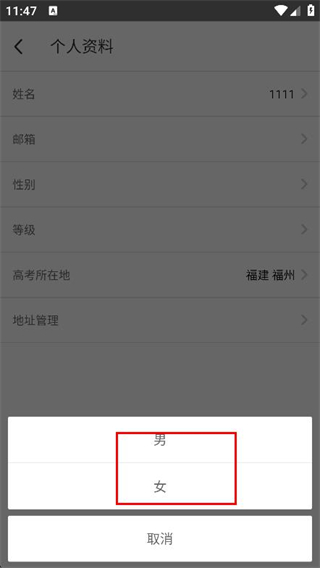 4、在弹出选择框中,选择男或女,即可设置性别。