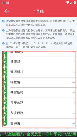 4、继续查看1号线后续站点,如共康路、富锦路等站点。