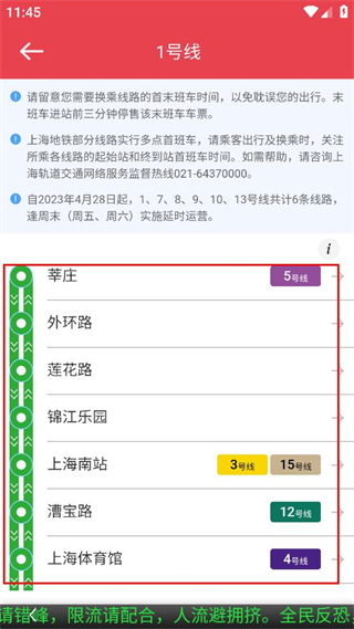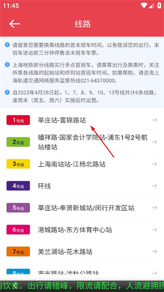 3、查看1号线的站点信息,包括莘庄、外环路等站点。