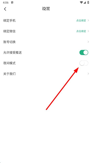 3、在设置页面找到夜间模式选项,点击其右侧的开关按钮将其开启。