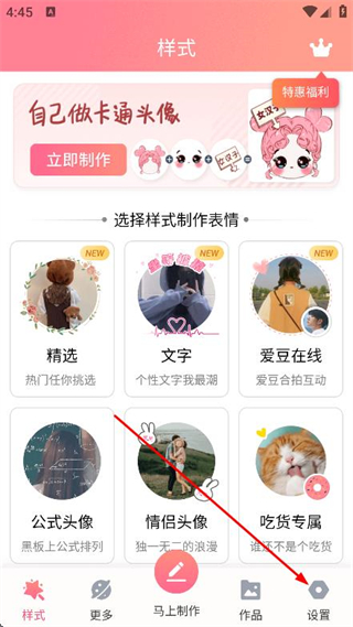 1、打开情侣头像制作,点击底部导航栏设置选项。