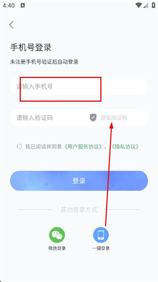 3、在手机号登录页面,输入手机号,点击获取验证码。
