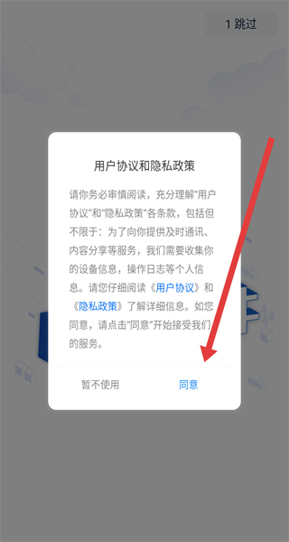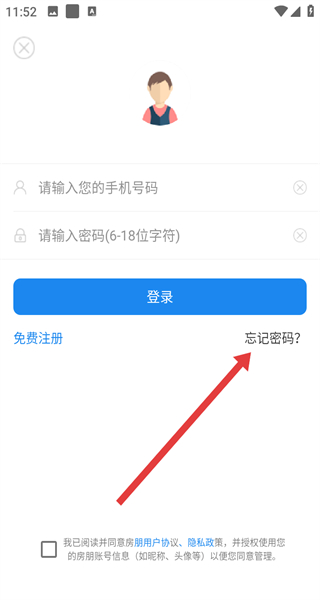 1、点击同意按钮,同意房朋的用户协议和隐私政策,进入登录界面。