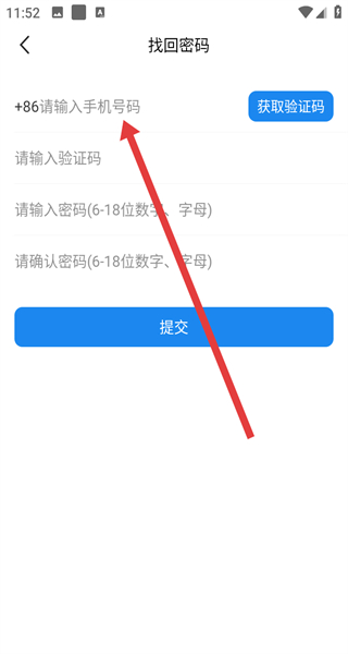 3、在找回密码界面,输入手机号码,点击获取验证码。