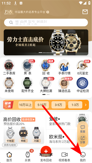 1、打开万表二手表平台app,点击进入买表页面,可依据热门品牌筛选心仪品牌,也能通过价格区间选择符合预算的手表。