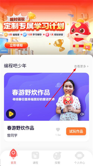 1、打开探月少儿编程APP,在首页找到编程吧少年板块,点击查看更多。