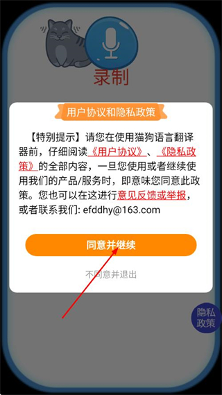 1、打开猫狗语言翻译器APP,点击同意并继续,进入主界面。