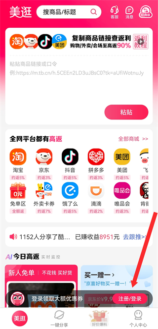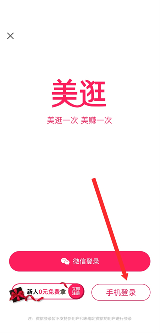 1、打开美逛APP,点击个人中心的注册/登录,进入登录选择页面。