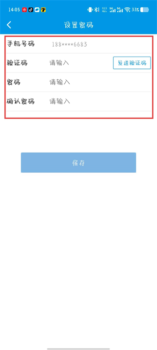 4、点击发送验证码按钮,输入验证码,输入密码并再次输入确认密码。