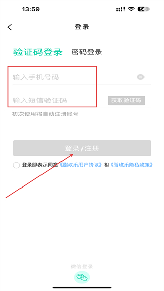 3、输入手机号码、验证码后,点击登录/注册按钮即可。