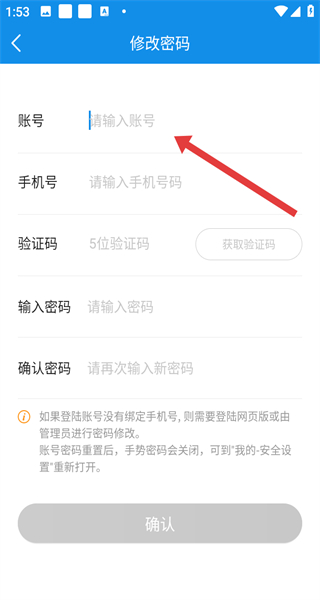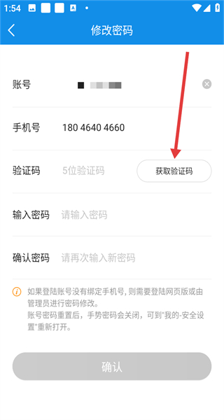 3、可以在修改密码界面,输入账号和手机号码信息进行获取验证码修改。