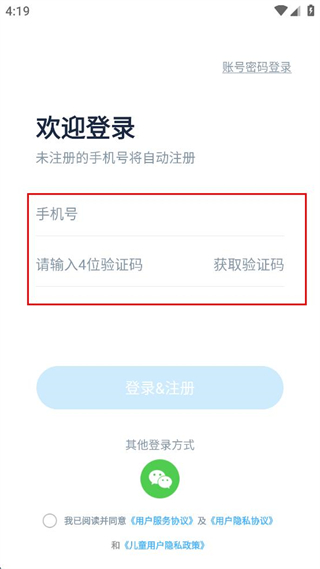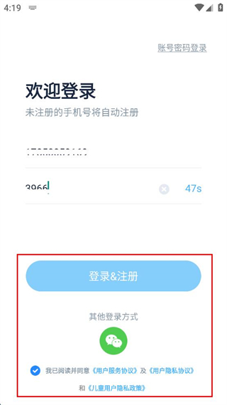 2、在登录界面输入手机号和验证码,勾选同意相关协议。