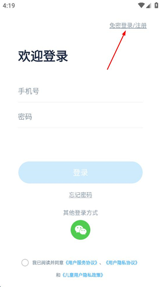 1、打开APP登录界面,点击“免密登录/注册”,进入手机号验证码登录界面。