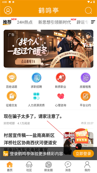 盐城鹤鸣亭是盐城地区最具影响力的社区门户网站,为盐城人民提供最全面最及时生活信息,是盐城最具人气的综合性门户网站。每天有超过50万的同城用户在鹤鸣亭讨论本地热点新闻、爆料最新八卦、分享身边美食、晒出生活美图、参与线上线下聚会,下载鹤鸣亭帮你快速找到盐城共同兴趣爱好的圈子。