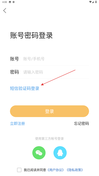 2、进入登录的页面内,点击短信验证码登录进行切换。
