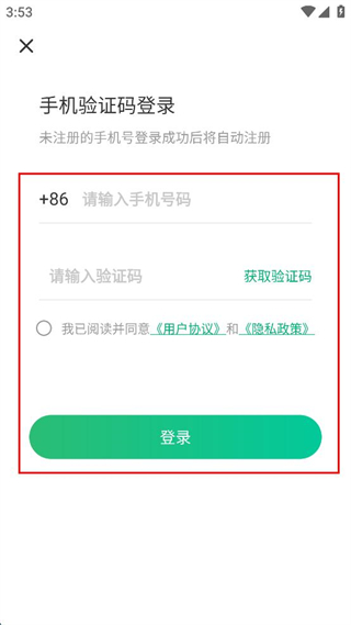 4、在登录界面输入手机号和验证码,勾选同意用户协议和隐私政策,点击“登录”按钮完成账号登录操作。