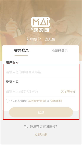 1、在买买团登录界面点击立即注册,进入账号注册页面。