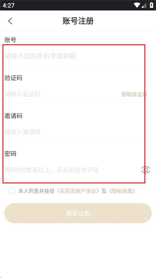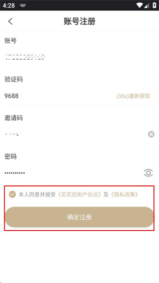 3、勾选本人同意并接受买买团用户协议及隐私政策,点击确定注册。