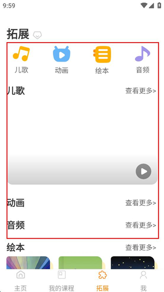 4、登录后点击“拓展”,即可查看儿歌、动画、绘本、音频等拓展内容。