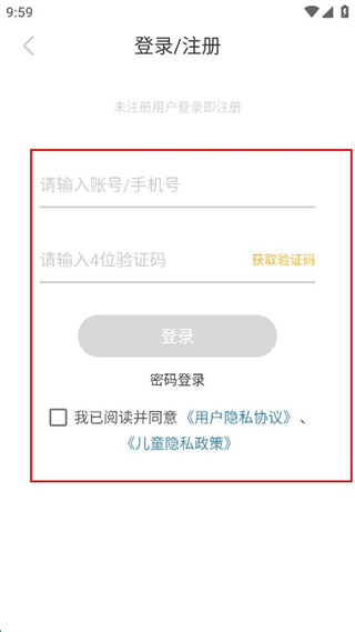 4、输入账号或手机号、验证码,勾选我已阅读并同意用户隐私协议、儿童隐私政策,点击登录,未注册用户登录即完成注册。
